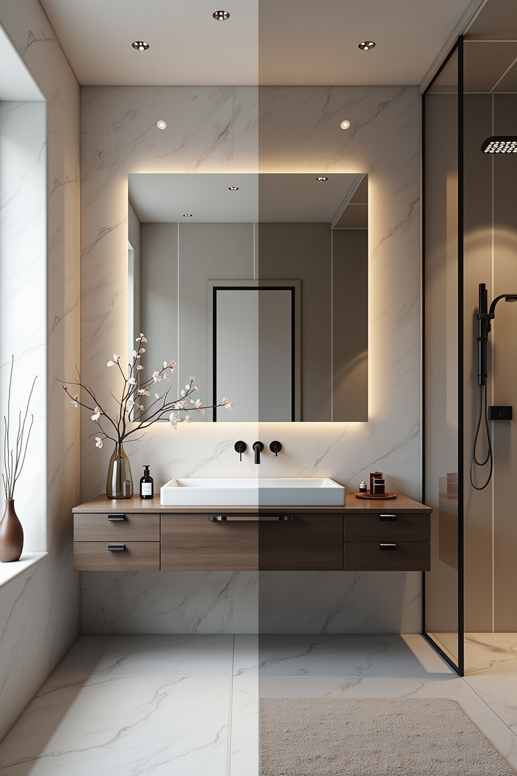 Bei der Bad-Renovierung spielen innovative Materialien eine entscheidende Rolle für die Transformation des Raumes, wie unsere Vorher-Nachher-Bilder eindrucksvoll belegen. Wo früher einfache Keramikfliesen dominierten, kommen heute großformatige Feinsteinzeugplatten mit Natursteinoptik oder fugenlose Wandbeschichtungen zum Einsatz, die nicht nur optisch überzeugen, sondern auch pflegeleichter sind. Der Austausch herkömmlicher Materialien gegen moderne Alternativen wie wasserfeste Vinylböden, Glasduschwände statt Vorhängen oder spezielle Badmöbel aus feuchtigkeitsresistenten Verbundstoffen sorgt für einen drastischen Unterschied im Erscheinungsbild. Die Vorher-Nachher-Gegenüberstellung verdeutlicht, wie diese neuen Materialien nicht nur die Ästhetik verbessern, sondern gleichzeitig für mehr Funktionalität, Langlebigkeit und einen zeitgemäßen Look sorgen.